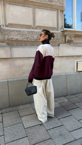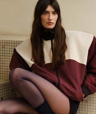 Achieve the perfect balance of sporty and feminine with the Windbreaker Jacket, a soft yet structured layer designed for movement and style. Made from peachy-feel fabric, it combines comfort and design with a seasonal hue-blocked palette in ecru white, black, and deep zinfandel red. Ideal for layering over fall outfits or adding a pop of color to your seasonal wardrobe.