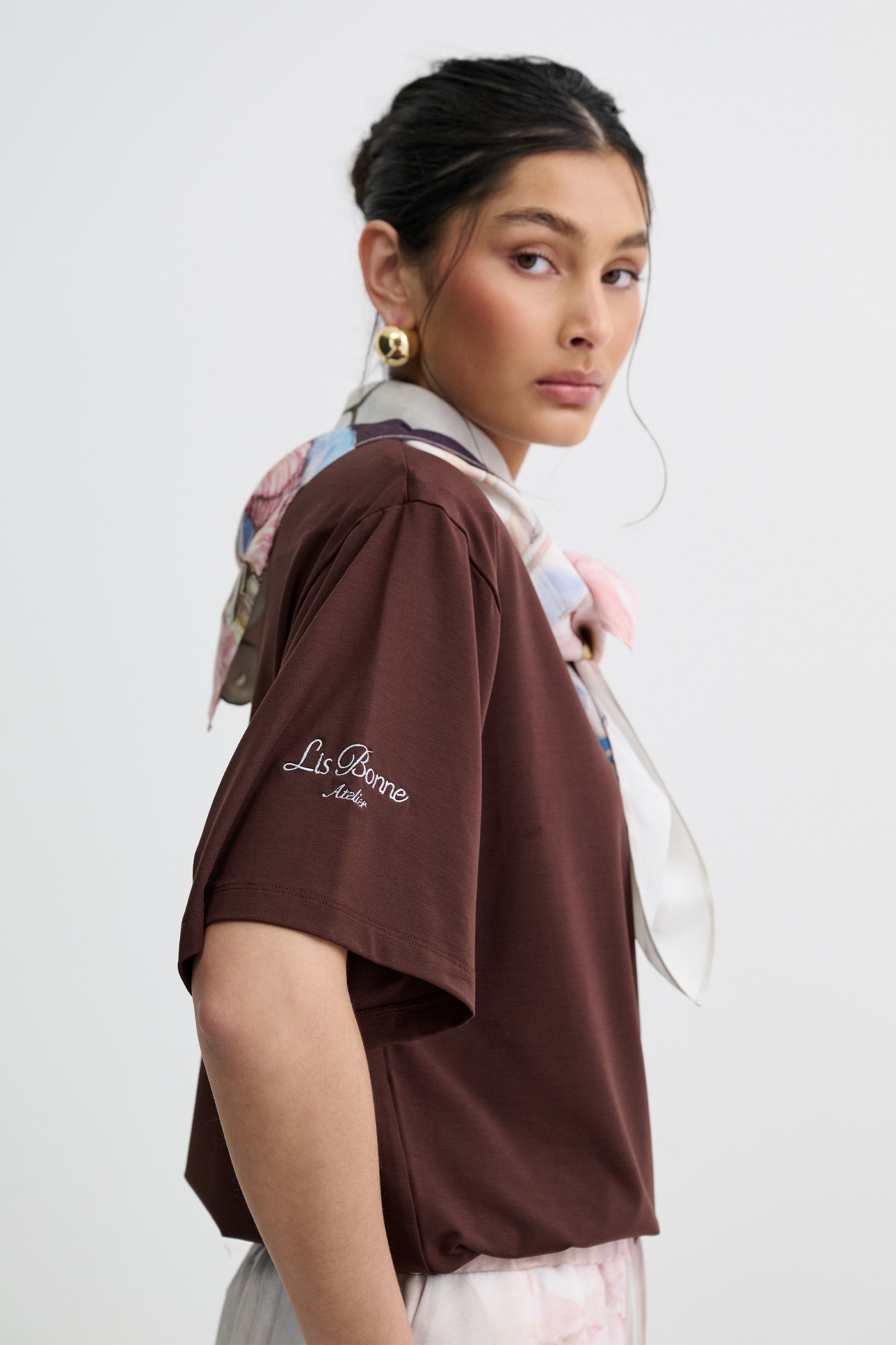 A sophisticated essential in deep brown that blends everyday comfort with high-fashion structure. Featuring detachable shoulder pads for a customizable silhouette. From sharp and architectural to soft and relaxed, it is finished with signature blue embroidery on the sleeve.