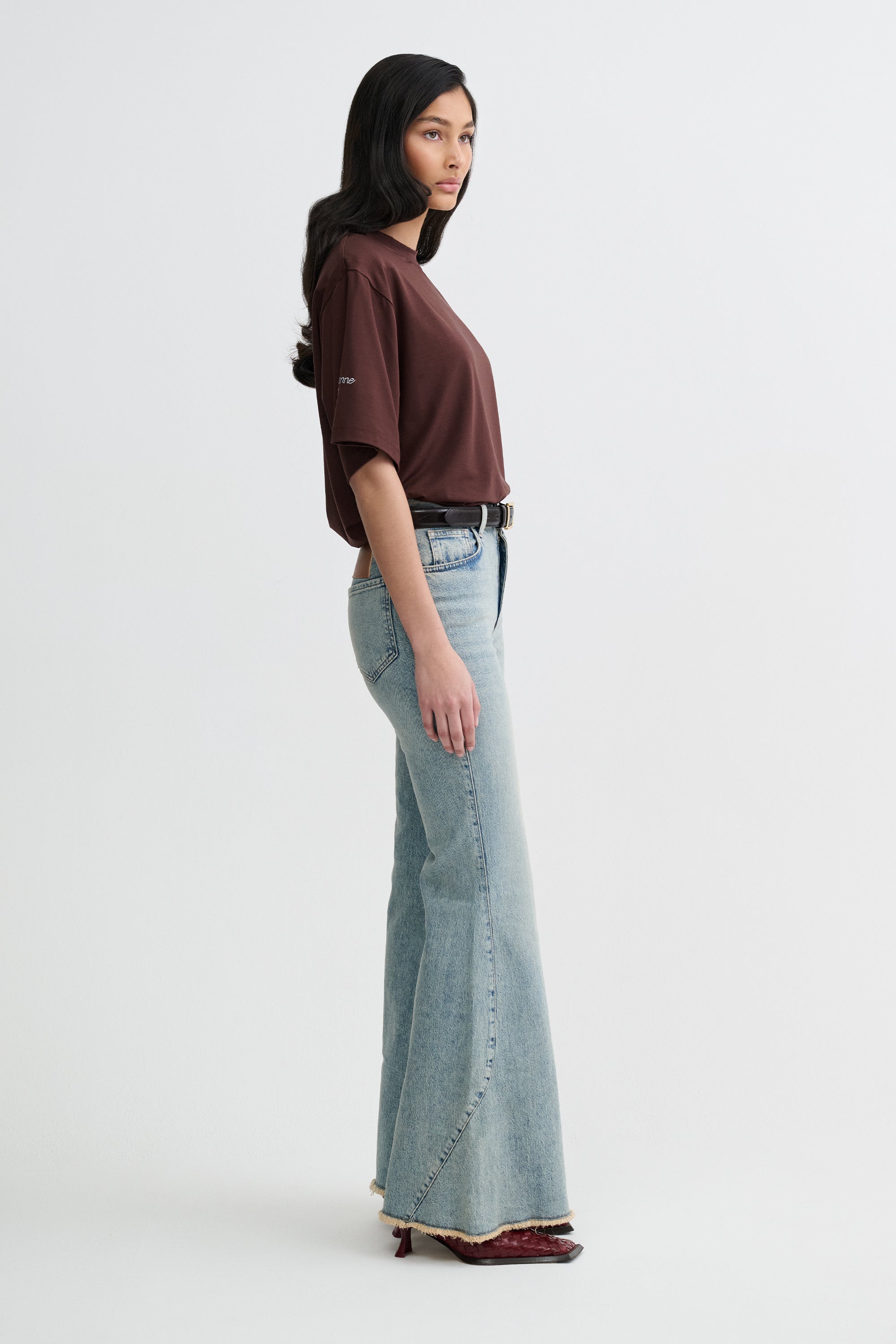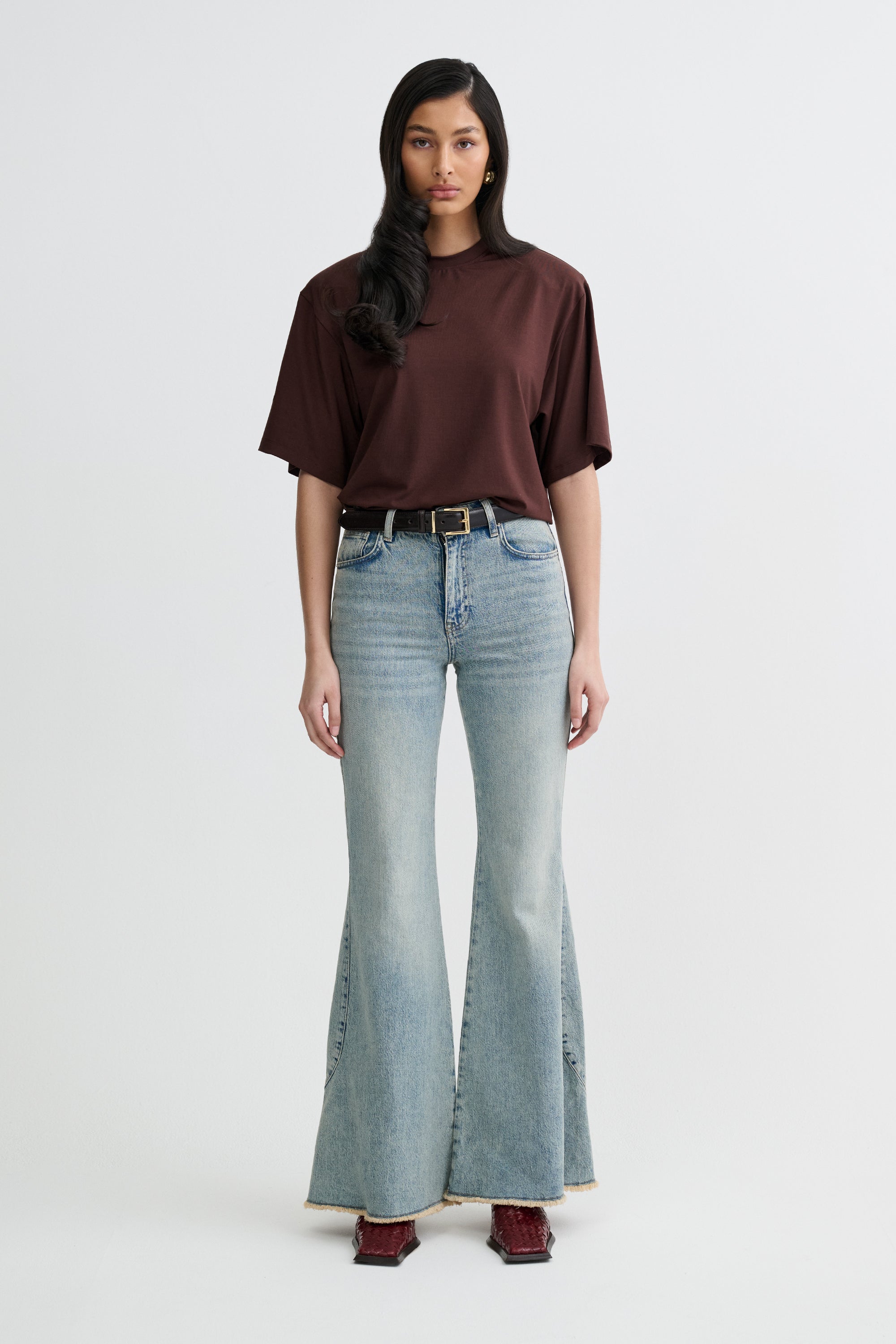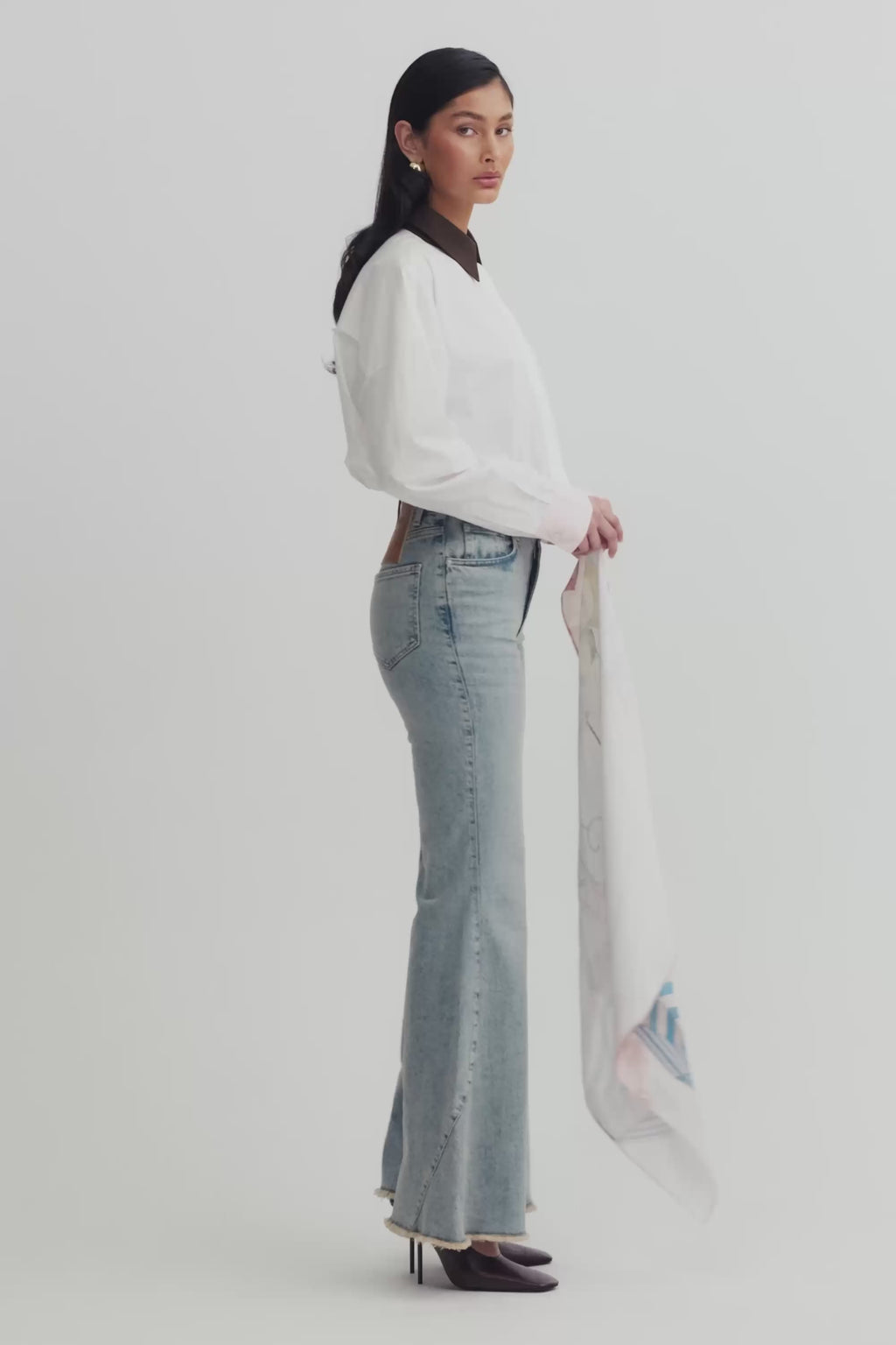 A new cornerstone of our core collection, the High Waist Flare Jeans 055 combine a vintage-inspired silhouette with modern, comfortable tailoring. Featuring a classic high-rise waist and a dramatic flare at the leg opening, these jeans are finished in a faded blue wash that perfectly matches our seasonal denim shirt, asymmetric dress, and wide-leg shorts.