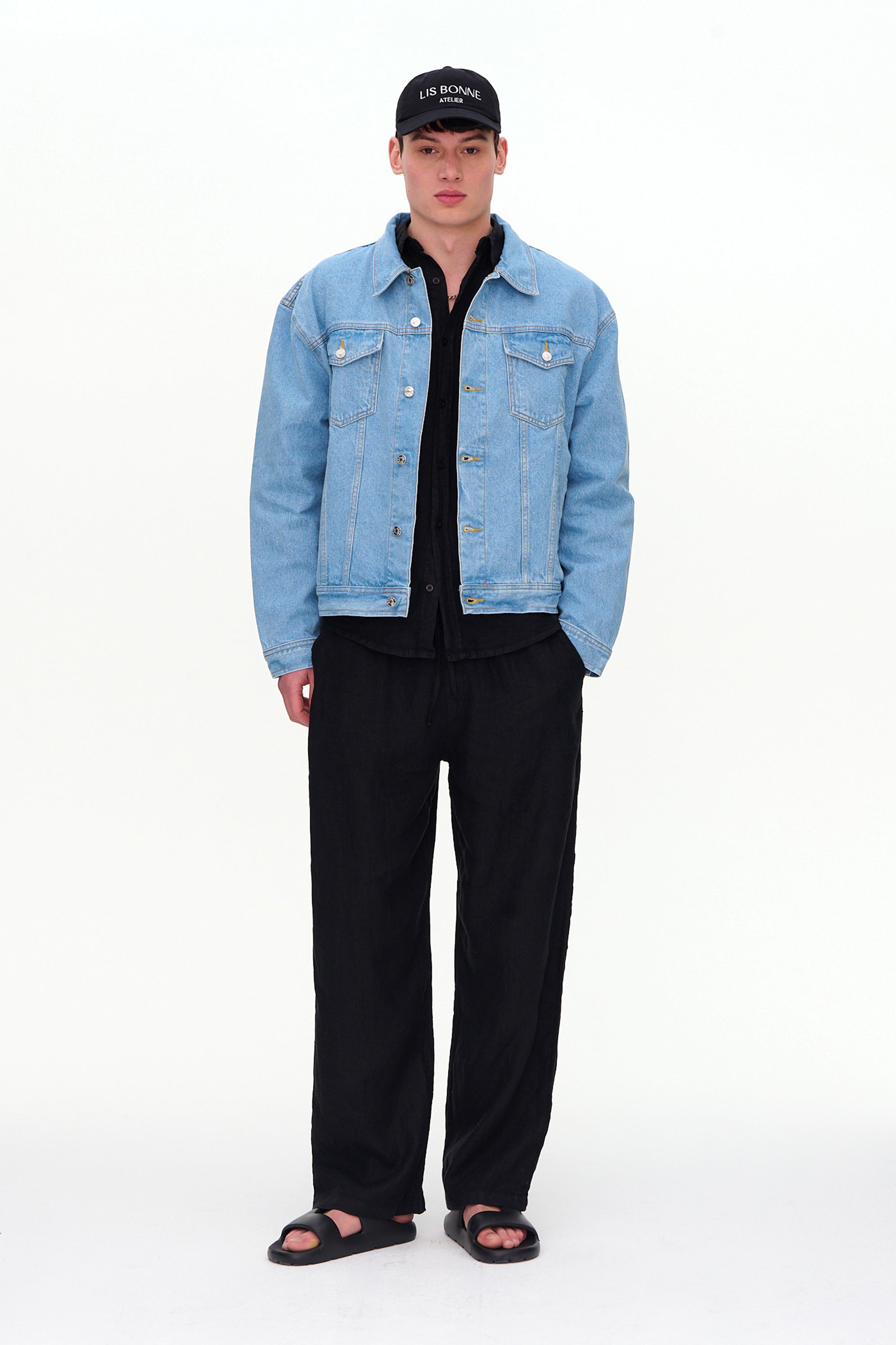 Lis Bonne Men indigo blue denim jacket, crafted from denim made of sustainable cotton. Detailed logo embroidery attached at the yoke. Additionally with side pockets and detailed logo buttons in shiny silver.